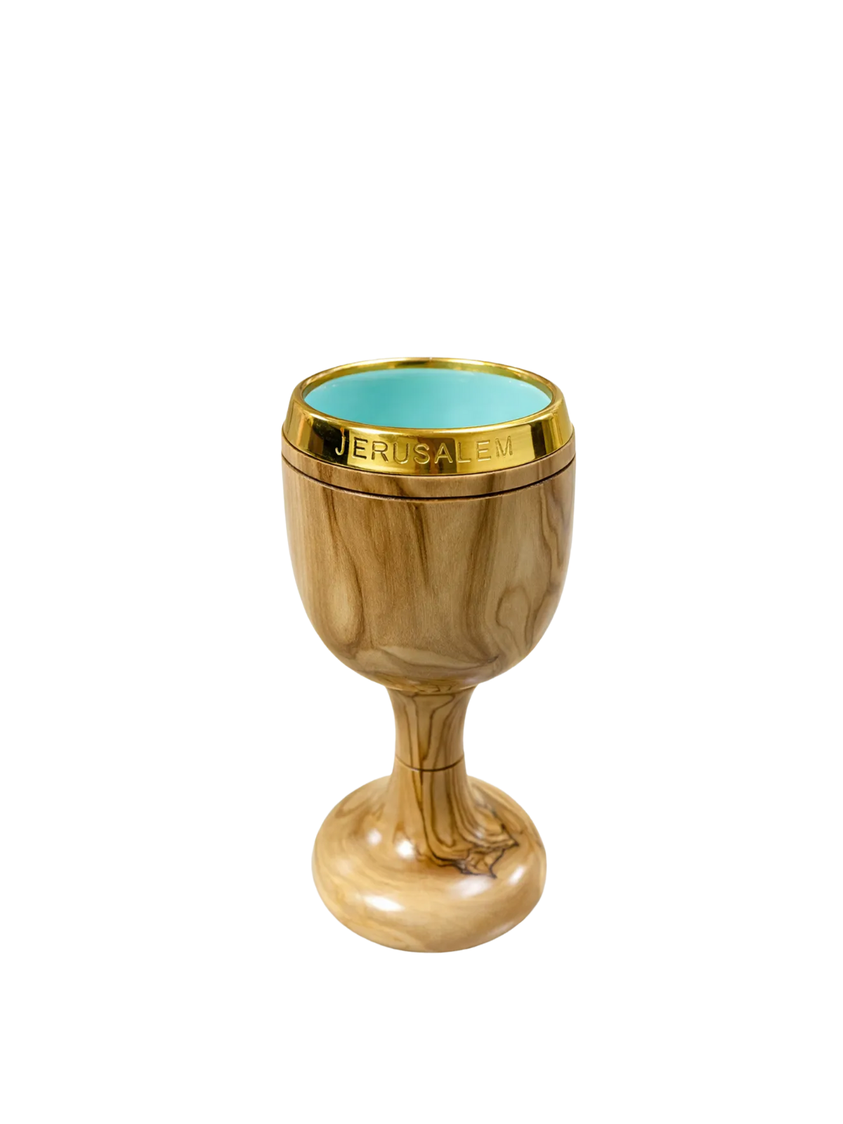 An olive wood goblet finished with a silver brim, showcasing the natural beauty of the material in a classic, elegant form.
